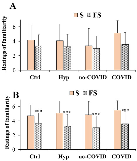 Ratings of familiarity dimension measured in total patients with hyposmia (Hyp, n = 57), subjects without (no-COVID, n = 34) or with (COVID, n = 23) post-acute coronavirus syndrome compared to healthy controls (Ctrl, n = 91), in response to saline solutions obtained with pure sea salt (S) and flavored salts (FS) at the concentrations of 0.1 g/mL (high dose) (A) and 0.04 g/mL (low dose) (B). Data are presented as mean values and standard deviations. For FS, each value of the taste dimensions was obtained as the mean of participant responses to the three different commercial FS samples. Significant differences among the four different groups of subjects (as between factors) in relation to type of salt (S and FS as within factor) were calculated using two-way repeated measures ANOVA. *** = p < 0.001 FS versus S.