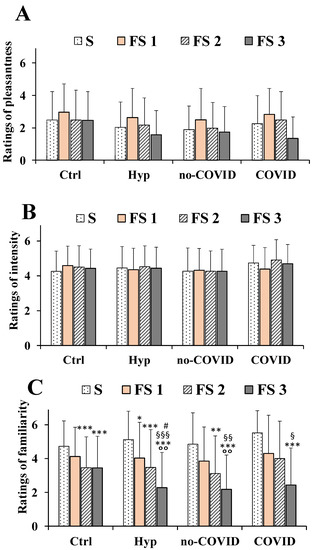 Ratings of pleasantness (A), intensity (B), and familiarity (C) dimensions measured in total patients with hyposmia (Hyp, n = 57), subjects without (no-COVID, n = 34) or with (COVID, n = 23) post-acute Coronavirus Syndrome compared to healthy controls (Ctrl, n = 91), in response to saline solutions obtained with pure salt (S) and flavored sea salts of myrtle (FS 1), of Mediterranean herbs/plants (FS 2), and of orange/saffron (FS 3) at the concentrations of 0.04 g/mL. Data are presented as mean values and standard deviations. Significant differences among the four different groups of subjects (as between factors) in relation to type of salt (S, FS 1, FS 2, and FS 3 as within factor) were calculated using a two-way repeated measures ANOVA. °° = p < 0.01 versus respective Ctrl; *** = p < 0.001, ** = p < 0.01, * = p < 0.05 versus S; §§§ = p < 0.001, §§ = p < 0.01, § = p < 0.05 versus FS 1; # = p < 0.05 versus FS 2.