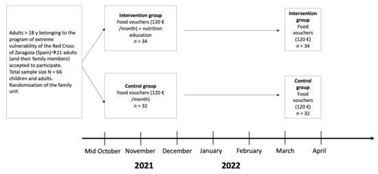 Therefore, the aim of this study was to assess if a 10-week intervention, including both food vouchers and nutritional and health education, improves diet quality, and, consequently, the health of vulnerable participants in Zaragoza (Spain). Additionally, both groups (intervention and control) received, 8-weeks after the above 10-week intervention, only food vouchers (no educational intervention) to assess whether the possible positive effect of this intervention was maintained over time.