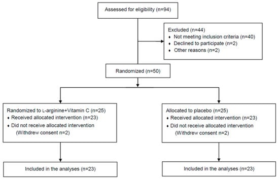 Out of 94 candidate participants screened, 50 (53.2%) met the inclusion criteria and agreed to be randomized to receive either the l-arginine plus vitamin C (n = 25) or placebo (n = 25) intervention. Two participants in each group withdrew their consent before receiving the allocated intervention and were not included in the analysis (Figure 1).