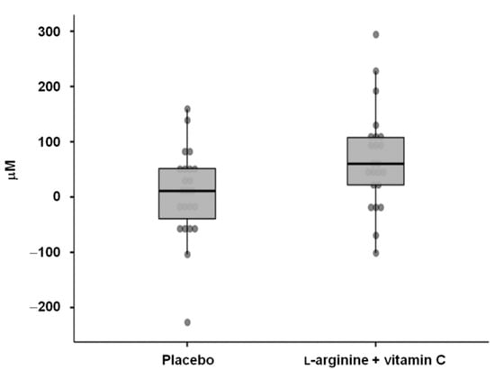 Participants had a median (IQR) age of 50.5 (14.0) years and were predominantly women (65.2%). Approximately half of the participants needed hospitalization during the acute COVID-19 episode, and four (8.7%) were admitted to ICU. The median (IQR) time that elapsed from COVID-19 diagnosis to inclusion in the study was 254.0 (136.5) days. The median (IQR) distance walked on the 6 min walk test was 520 (90) m, while the handgrip strength was 22.6 (14.4) kg. Flow-mediated dilation at baseline was 9.8%. The median (IQR) serum l-arginine concentration was 170.6 (88.0) µM, with no differences between the intervention groups. However, serum l-arginine values were lower than those observed in the sample without evidence of previous SARS-CoV-2 infection (median (IQR) 222.1 (23.1) µM; p = 0.04). At 28 days, serum l-arginine concentrations increased more in the participants who received l-arginine plus vitamin C supplementation (+60.2 (85.8) µM) than in the placebo group (+11.0 (90.8) µM; p = 0.02; mean difference 62.4 µM, 95% confidence interval (CI): 11.1–113.7 µM; effect size = 0.72) (Figure 2). After 28 days of l-arginine plus vitamin C supplementation, serum l-arginine levels in the active group (222.8 (88.6) µM) were comparable to those of the controls with no previous SARS-CoV-2 infection (p = 0.8).