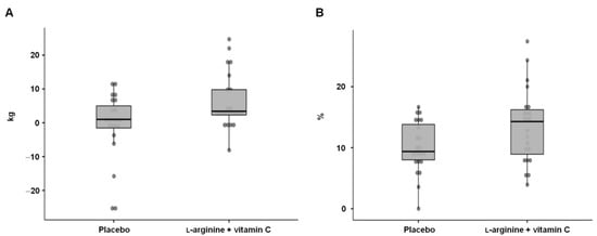 At 28 days, l-arginine plus vitamin C supplementation induced greater improvements in handgrip strength (+3.4 (7.5) kg) compared with the placebo (+1.0 (6.6) kg, p = 0.03; mean difference = 3.4 kg, 95% CI: 0.5–9.4 kg; effect size = 0.37) (Figure 4A). At baseline, around 60% of the study participants had a handgrip strength below the 25th percentile of age- and sex-specific reference values [37]. After 28 days of intervention, more participants who received l-arginine plus vitamin C than those in the placebo group (57% vs. 30%) were above the first quartile of handgrip strength reference values [37], although the difference between the groups did not reach the statistical significance (p = 0.07).