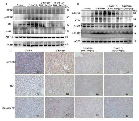 ER stress is also a therapeutic target for NAFLD. It can be directly activated by glucolipotoxicity. Saturated fatty acids alter phospholipids’ composition in the ER membrane and then trigger ER stress through the sensors of IRE1α and PERK even in the absence of unfolded proteins [34,35]. Studies have indicated that both IRE1α-XBP1 and PERK-EIF2 arms participate in hepatic steatosis through the regulation of DNL, lipogenesis, and very low-density lipoprotein secretion [14,36,37]. The IRE1α-XBP1 pathway can trigger de novo lipogenesis (DNL) by SREBP1 and its downstream genes [38]. Cho et al. [39] suggested that allopurinol relieved hepatic steatosis induced by high-fructose diet through the modulation of ER stress via the IRE1 pathway. Wu et al. [40] showed that Patchouli alcohol attenuated ER stress and hepatic steatosis through inhibiting the activation of PERK and IRE1 pathways in HFD-fed rats. Our study showed that the expressions of proteins involved in PERK and IRE1 arms were upregulated greatly in the liver of D-NAFLD rats. DIO administration decreased their expressions. In addition, proteins associated with apoptosis mediated by ER stress, including ATF4, p-CHOP, and caspase 12 were also downregulated by DIO. The inhibitory effects of DIO (20 mg/kg) on ER stress were better than that of DIO (10 mg/kg).