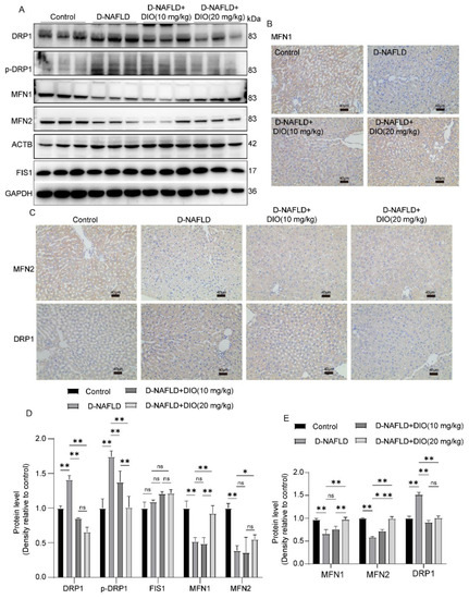DIO ameliorated the disorder of mitochondrial fission and fusion in the liver of D-NAFLD rats. (A) Western blot images of DRP1, p-DRP1, MFN1, MFN2, FIS1, ACTB, and GAPDH. (B) The images of MFN1 immunohistochemistry, ×100, scale bars = 40 µm. (C) The images of MFN2 and DRP1 immunohistochemistry, ×100, scale bars = 40 µm. (D) Relative protein expressions of DRP1, p-DRP1, FIS1, MFN1, and MFN2. (E) Positive staining area of MFN1, MFN2, and DRP1 immunohistochemistry. n = 3 and the data were presented as mean ± SD. ns indicates no significance, * and ** indicate significant difference and highly significant difference, respectively.