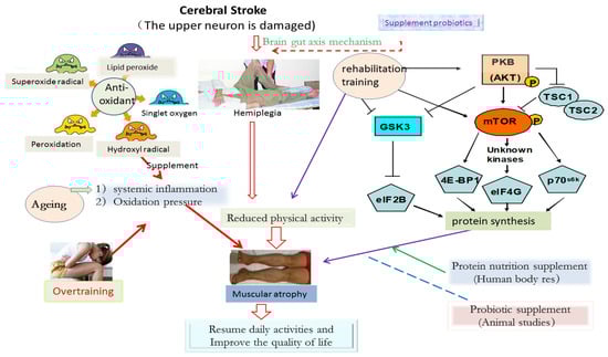 Reviewing the recent literature, we suggest that, compared with simply supplementing probiotics or polyphenol antioxidants, combined with rehabilitation exercise specifically for patients with chronic stroke, it may have a better effect on reducing oxidative stress and slowing down neural/motor function degradation. However, the above studies on nerve injury or stroke are mostly the results of animal experiments, so the actual benefits still need to be confirmed by subsequent human studies. The change of intestinal microbiota may be closely related to some neuropathies. Adjusting the distribution of intestinal microbiota by adding probiotics is helpful to prevent or alleviate degenerative neuropathy. Although there is no research evidence to explore whether probiotic supplementation can promote the recovery of neurological function in patients with chronic stroke, recent cumulative research also shows possible benefits. These research results all show that the application of probiotics has potential benefits for promoting the recovery of neural function or sports ability in combination with sports rehabilitation. Therefore, a supplement of antioxidants may be a feasible strategy to help reduce oxidative stress and systemic inflammatory reaction in patients with chronic stroke.