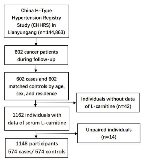 During the CHHRS follow-up, 602 cancer cases occurred in Lianyungang District among 144,863 participants. A nested case-control study comprising 602 newly diagnosed cancer cases and 602 matched controls from the same district was conducted. Those individuals who had not developed cancer during the follow-up were chosen as controls, and they were matched by age (±1 year), sex, and residence, in a 1:1 ratio. After excluding patients with missing LC measurements (n = 42) and unpaired individuals (n = 14), a total of 1148 participants (574 cancer cases vs. 574 matched controls) were included in the final analysis (Figure 1), with 213 digestive system cancer and 361 non-digestive system cancer cases.