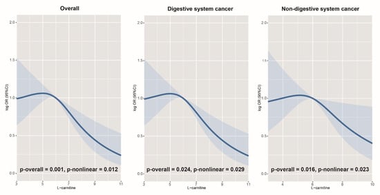 The median follow-up period for the current study was 3.02 (1.92, 3.40) years. The association between LC concentrations and incident cancer risk is shown in Figure 2. We found an inverse and nonlinear relationship between LC concentrations and the risk of overall (p-overall = 0.001, p-nonlinear = 0.012), digestive system (p-overall = 0.024, p-nonlinear = 0.029), and non-digestive system cancer (p-overall = 0.016, p-nonlinear = 0.023). Table 2 and Table 3 present the ORs (95% CI) for the association of LC with the risk of overall, digestive system, and non-digestive system cancer. Serum LC (per unit increment) significantly lowered the risk of overall cancer (OR = 0.86, 95% CI: 0.79 to 0.94), digestive system cancer (OR = 0.82, 95% CI: 0.69 to 0.97), and non-digestive system cancer (OR = 0.87, 95% CI: 0.78 to 0.98) in the multivariate analysis. Compared with patients with low LC (Q1), patients in the highest quartile (Q4) had a 33% (OR = 0.67, 95% CI: 0.46 to 0.99), 52% (OR = 0.48, 95% CI: 0.23 to 0.99), and 39% (OR = 0.61, 95% CI: 0.38 to 0.99) decreased risk of overall, digestive system, and non-digestive system cancer in the adjusted models, respectively. Patients with higher concentrations (≥median) of LC also exhibited a decreased risk of overall (OR = 0.75, 95% CI: 0.57 to 0.99) and digestive system cancer (OR = 0.57, 95% CI: 0.34 to 0.97) in the adjusted models compared to those with lower concentrations (<median).