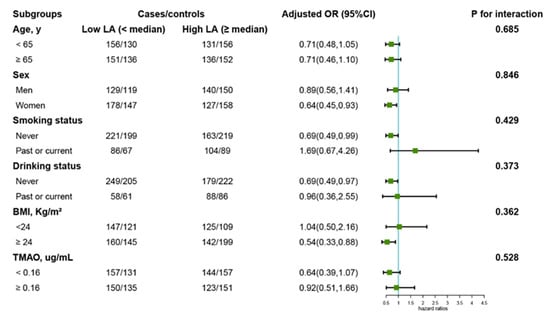 Figure 3 illustrates the subgroup analysis of the association of serum LC (low vs. high divided by the median of LC) with overall cancer risk. Age (<65 (median) vs. ≥65 y), sex, smoking (never vs. past or current) and drinking (never vs. past or current) status, BMI (normal <24 vs. overweight (obese) ≥24 kg/m2), and TMAO (<0.16 (median) vs. ≥0.16 µg/mL) did not modify the effect of LC on the occurrence of overall cancer risk (all p for interaction < 0.05). An inverse association of LC with cancer risk was observed in individuals with higher BMI (≥24 kg/m2), never drinkers, never smokers, and females. We also explored the effect of serum TMAO levels on the occurrence of overall cancer (Table 4). In the current study, participants with elevated levels of TMAO (Q3, 0.16–0.25 µg/mL) had a 43% decreased risk of overall cancer in the adjusted model (OR = 0.57, 95% CI: 0.37 to 0.90).
