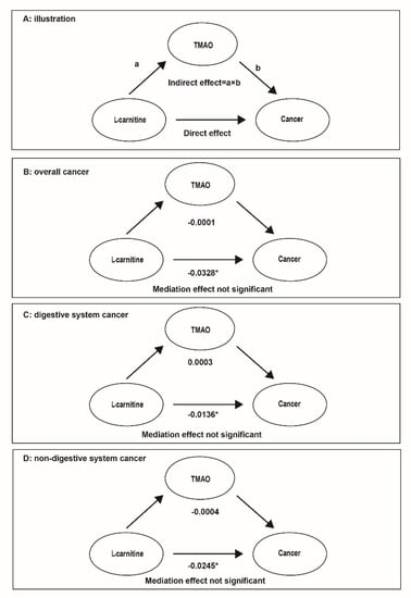 TMAO has been demonstrated to be closely related with the levels of LC. In addition, though the results are inconsistent, the close relationship between TMAO and cancer risk has been explored previously. To further explore whether the effect of serum LC concentrations on the occurrence of cancer is mediated by levels of TMAO, the CAUSALMED procedure was utilized by using the variance–covariance matrix and the maximum likelihood method. This procedure calculated the total effect (the sum of the direct and indirect effects), the direct effect (the effect without the mediator’s influence), and the indirect effect (the independent variable’s influence on the mediator multiplied by the mediator’s influence on the outcome).