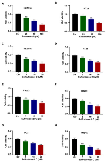 Effect of suffruticosol C and resveratrol on the growth of various cancer cells. HCT116 (A) and HT29 (B) cells were treated with different concentrations of resveratrol for 72 h, and the viability of cells was detected by CCK-8. HCT116 (C), HT29 (D), Caco2 (E), H1299 (F), PC3 (G), and HepG2 (H) cells were treated with different concentrations of suffruticosol C for 72 h, and the viability of cells was detected by CCK-8. All samples were normalized to cell number and conducted with three independent replicates. Data were analyzed by one-way ANOVA (A–H) were expressed as Mean ± SD (A–H). Different colors represent the different concentration of resveratrol or suffruticosol C. *, p < 0.05; **, p < 0.01; ***, p < 0.001. Ctr: normal control group.