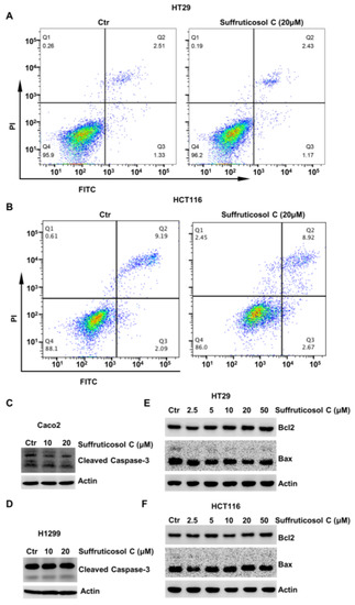 It is widely known that autophagy, apoptosis, and ferroptosis are major mechanisms involved in cell viability. Therefore, the function of suffruticosol C on apoptosis in HT29 and HCT116 cells by FCAS was evaluated. After treatments with 20 µM suffruticosol C, we did not observe an obvious function on the apoptosis of H1299 cells (Figure 2A,B). To confirm that suffruticosol C did not affect the apoptosis of cancer cells, we further investigated the levels of apoptotic proteins of the caspase family and the Bcl-2 family. Caspase 3 is considered to be the most important caspase in the induction of apoptosis and is, therefore, used as an apoptotic marker. Accordingly, the level of cleaved caspase 3 was assessed in cancer cells after treatment with various concentrations of suffruticosol C. As shown in Figure 2C,D, there was no detectable difference in apoptosis rate between the control and suffruticosol C-treated Caco2 and H1299 cells. Moreover, suffruticosol C did not have a significant effect on the anti-apoptotic protein Bcl-2 and pro-apoptotic protein Bax in HT29 and HCT116 cells (Figure 2E,F).
