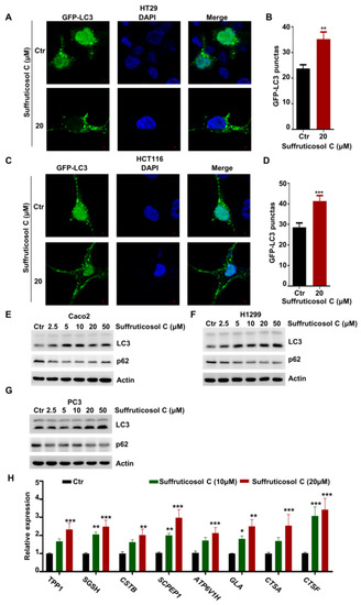 The treatment of cancer cells with suffruticosol C promoted autophagy, because an increasing number of punctate GFP-LC3 foci were observed after bafilomycin A1 treatment in HT29 and HCT116 cells (Figure 4A–D). Moreover, we investigated the autophagy markers LC3II and p62. A sharp increasing level of LC3II and a sharp decreasing level of p62 were observed in response to treatments with different concentrations of suffruticosol C (Figure 4E–G). This indicates that suffruticosol C mainly affects cell viability through its effects on autophagy. Therefore, we further investigated the function of suffruticosol C in regulating the genes associated with lysosome biogenesis and the restoration of autophagosome initiation. We found that the expression of TPP1, SGSH, SCPEP1, CSTB, ATP6V1H, CTSA, CTSF, and GLA was significantly enhanced after 24 h treatments with suffruticosol C (Figure 4H). This indicates that autophagy is essential for suffruticosol C-initiated cell death.
