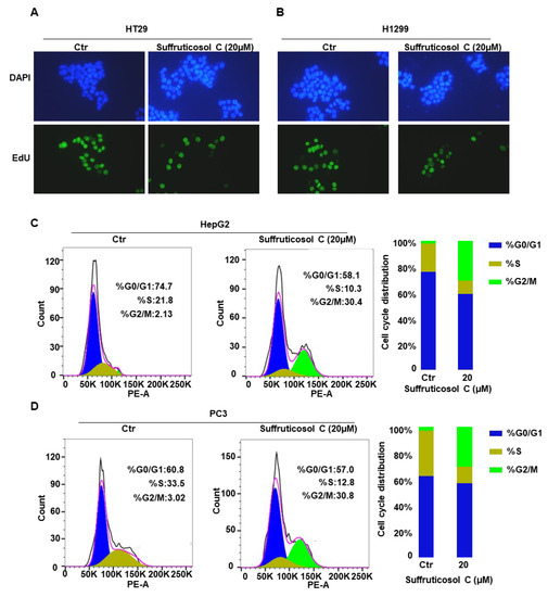 Induction of cell death by suffruticosol C via cell cycle arrest. HT29 (A) and H1299 (B) cells were treated with suffruticosol C for 24 h, and the cell proliferation analysis was undertaken using an EdU (5-ethynyl-2-deoxyuridine) assay. HepG2 (C) and PC3 (D) cells were treated with suffruticosol C for 24 h, the cell cycle analysis using flow cytometry after staining with propidium iodide (PI).