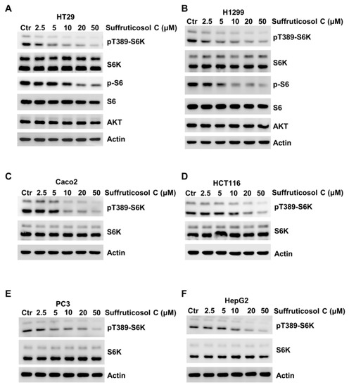 Suffruticosol C inhibits mTORC1 activation. HT29 (A), H1299 (B), Caco2 (C), HCT116 (D), PC3 (E), and HepG2 (F) cells were treated with different concentrations of suffruticosol C for 24 h, and the level of pT389-S6K, p-S6, and the indicated protein were detected by WB.