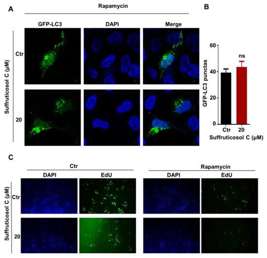 To examine whether the function of suffruticosol C on autophagy occurs in an mTORC1-dependent manner, rapamycin, an inhibitor of mTORC1, was used to treat the cells. The results showed that the suffruticosol C treatment did not promote rapamycin-mediated autophagy, as indicated by the presence of GFP-LC3II puncta (Figure 7A,B). Moreover, we examined whether mTORC1 associated with the regulation of cell proliferation mediated by suffruticosol C. Our EdU assay exhibited that rapamycin treatments entirely reversed the effect of suffruticosol C on cell proliferation (Figure 7C). Based on all these findings, we concluded that suffruticosol C induced cell autophagy and cell proliferation by the negative regulation of mTORC1 activities.