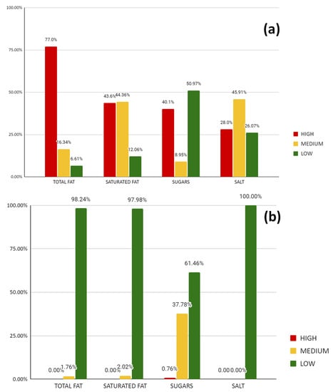 Percentage of foods with high, medium and low content of fats, saturated fat, sugars and salt expressed per 100 g of food product (a) and percentage of beverages with high, medium and low content of fats, saturated fat, sugars and salt expressed per 100 mL (b) in the whole campus. Classification according to the criteria in the Guide to creating a front-of-pack (FoP) nutritional label for pre-packed products sold through retail outlets.
