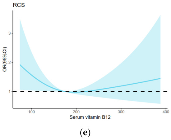 Restricted cubic spline (RCS) regression analysis of group B vitamins including (a) serum vitamin B1, (b) serum vitamin B2, (c) serum vitamin B6, (d) serum folate, and (e) serum vitamin B12 with GDM risk. The median of vitamin B1 86.5 pmol/L, B2 13.5 pmol/L, B6 27.2 pmol/L, folate 11.8 nmol/L and B12 174.8 pmol/L was selected as the reference levels, respectively. The lines indicate estimated ORs, and the light-blue–shaded areas represent 95% CI.