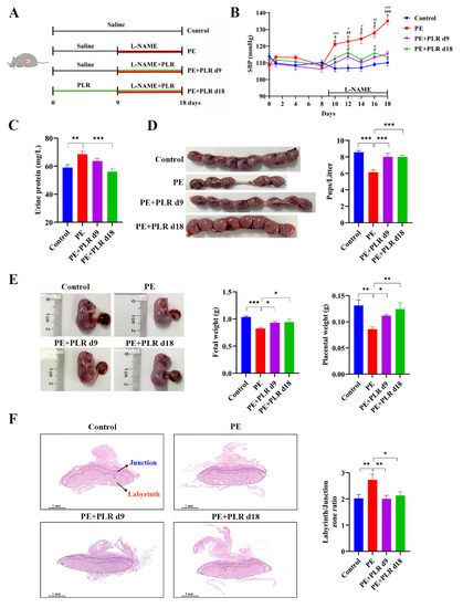 To evaluate the efficacy of therapeutic (GD9 to GD18) and preventive (GD0 to GD18) PLR administration in alleviating PE, we used an L-NAME-induced PE mouse model (Figure 1A). As shown in Figure 1B, no significant difference in SBP was detected between each group before GD9, suggesting that PLR did not induce hypertension in the subjects of the study. However, compared with the Control group, the SBP in the PE group was significantly and persistently increased after L-NAME induction (GD10, 122.9 ± 1.2 mmHg versus 106.6 ± 1.8 mmHg, p < 0.001). Meanwhile, the urine protein concentration was also markedly elevated in mice of the PE group on GD18 (Figure 1C). These data indicated that the PE mouse model was successfully established.