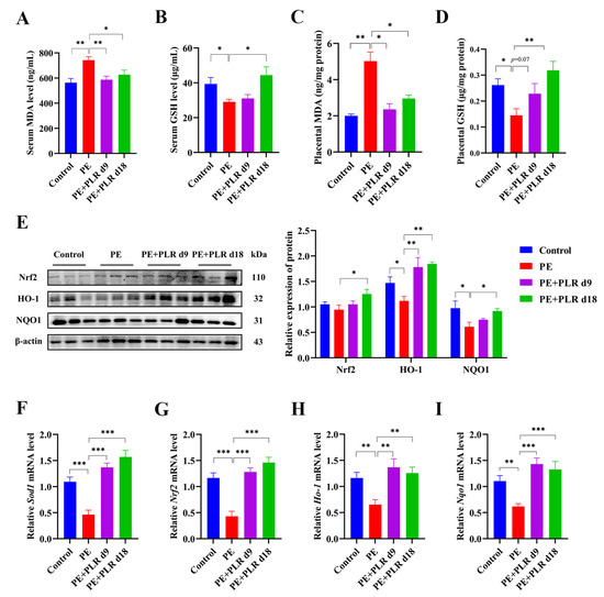 PLR attenuated oxidative stress and upregulated the placental Nrf2/HO-1/NQO1 pathway in PE mice. (A–D) ELISA was used to analyze the concentrations of malondialdehyde (MDA) and glutathione (GSH) in the placenta and serum of different groups. (E) Representative Western blot bands and the relative density analysis results of Nrf2, HO-1, and NQO1 in placenta. β-actin was set as a loading control, and the relative expressions were normalized to the control. (F–I) Relative mRNA levels of Sod1, Nrf2, Ho-1, and Nqo1 in placenta. For (A–D), n = 8 for each group. For (E), n = 3 for each group. For (F–I), n = 6 for each group. Data are expressed as the mean ± SEM. * p < 0.05, ** p < 0.01, *** p < 0.001 (ANOVA test).