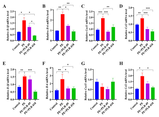 PLR attenuated gut and placental inflammation in PE mice. (A–D) Relative mRNA levels of interleukin-1β (Il-1β), interleukin-6 (Il-6), C-X-C motif chemokine ligand 1 (Cxcl1), and C-C motif chemokine ligand 2 (Ccl2) in placenta. (E–H) Relative mRNA levels of Il-1β, Il-6, Cxcl1, and Ccl2 in the colon. In this figure, n = 6 for each group. Data are expressed as the mean ± SEM. * p < 0.05, ** p < 0.01, *** p < 0.001 (ANOVA test).
