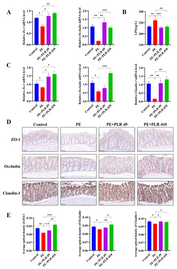 PLR protected the gut and placental barriers in PE mice. (A) Relative mRNA levels of Zo-1 and Occludin in placenta. (B) Serum lipopolysaccharide (LPS) levels were measured by ELISA. (C) Relative mRNA levels of Zo-1, Occludin, and Claudin-1 in the colon. (D) Representative image of ZO-1, Occludin, and Claudin-1 immunohistochemistry staining in colon tissues (original magnification, ×400; scale bar = 50 µm). The average optical densities of ZO-1, Occludin, and Claudin-1 in the colon (E) were measured by Image-Pro Plus software. For (A,C), n = 6 for each group. For (B), n = 7 for each group. For (E), n = 4 for each group. Data are expressed as the mean ± SEM. * p < 0.05, ** p < 0.01, *** p < 0.001 (ANOVA test).