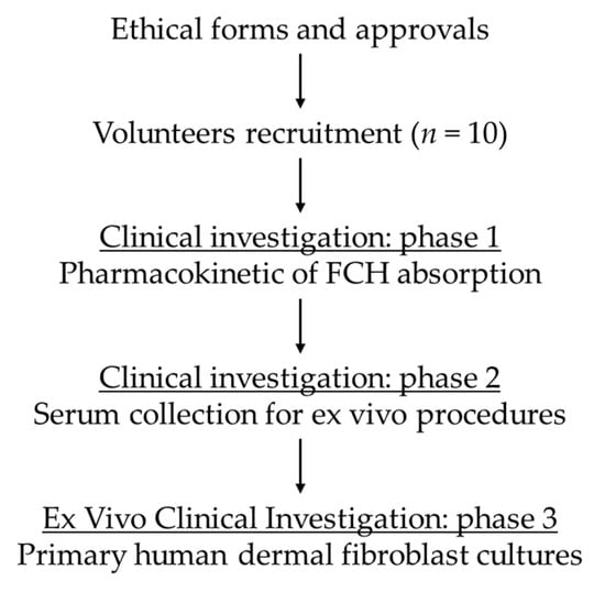 The clinical study was designed in two phases. The first phase aimed at characterizing the kinetics of the apparition of the metabolites following FCH ingestion in order to both (1) evidence the human absorption of the ingredient and (2) determine the time frame of the absorption peak for the second phase. The second phase was dedicated to collect both naive and enriched sera, before ingestion and at the absorption peak, respectively. Both naive and enriched human sera were subjected to ex vivo investigations to evaluate the influence of human metabolites resulting from the consumption of FCH on the function of human dermal fibroblasts.