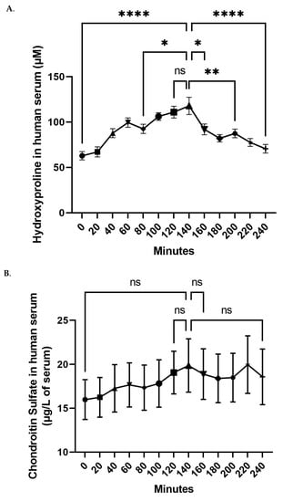 Evolution of the concentration of the circulating hydroxyproline (A) and chondroitin sulfate (B) in blood. Values are presented as the means ± SEM. The differences were considered statistically significant at p < 0.05 with * for p < 0.05; ** for p < 0.01; **** for p < 0.0001 and ns for p > 0.05.