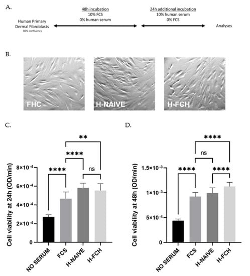 Primary human dermal fibroblasts (adult) subjected to ex vivo procedures (A). Regular fibroblastic shape upon human serum incubation (B). Cell viability measured with an XTT-based assay upon either FCS or human serum incubation (H-NAIVE for human naive serum and H-FCH for human serum enriched with circulating FCH metabolites) for 24 h and 48 h (C,D). Measures were performed in quadruplicates per condition/volunteer (n = 10 volunteers). Values are presented as the means ± SD. The differences were considered statistically significant at p < 0.05 with ** for p < 0.01; **** for p < 0.0001 and ns for p > 0.05.