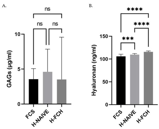 Primary human dermal fibroblasts (adult) were incubated in the presence of either fetal calf serum (FCS) or human naive serum (H-NAIVE) or human serum enriched with metabolites deriving from FCH ingestion (H-FCH). Glycosaminoglycans (GAGs) (A) and hyaluronan (HA) (B) production. Measures were performed in quadruplicates per condition/volunteer (n = 10 volunteers). Values are presented as the means ± SD. The differences were considered statistically significant at p < 0.05 with *** for p < 0.001; **** for p < 0.0001 and ns for p > 0.05.