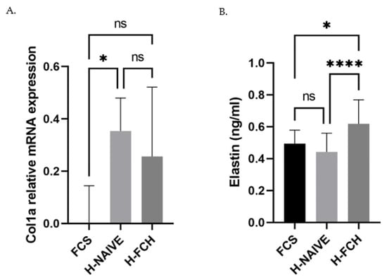 Primary human dermal fibroblasts (adult) were incubated in the presence of either fetal calf serum or human naive serum (H-NAIVE) or human serum enriched with metabolites deriving from FCH ingestion (H-FCH). Collagen 1a mRNA expression (A) and elastin protein concentration (B). Measures were performed in quadruplicates per condition/volunteer (n = 10 volunteers). Values are presented as the means ± SD. The differences were considered statistically significant at p < 0.05 with * for p < 0.05; **** for p < 0.0001 and ns for p > 0.05.