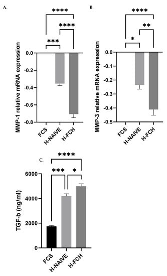 Primary human dermal fibroblasts (HDFs—adult) were incubated in the presence of either fetal calf serum or human naive serum (H-NAIVE) or human serum enriched with metabolites deriving from FCH ingestion (H-FCH). MMP1 and MMP3 mRNA relative expression (A,B). TGF-β release by HDFs (C). Measures were performed in quadruplicates per condition/volunteer (n = 10 volunteers). Values are presented as the means ± SEM. The differences were considered statistically significant at p < 0.05 with * for p < 0.05; ** for p < 0.01; *** for p < 0.001 and **** for p < 0.0001.