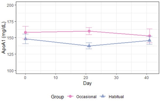 | ApoA1, mg/dL Occ. vs. Hab. All | −13.8 (−27.9–0.3) | 0.055 | −15.5 (−29.5–[−1.5]) | 0.03 | −14.7 (−24.6–[−4.7]) | 0.004 |