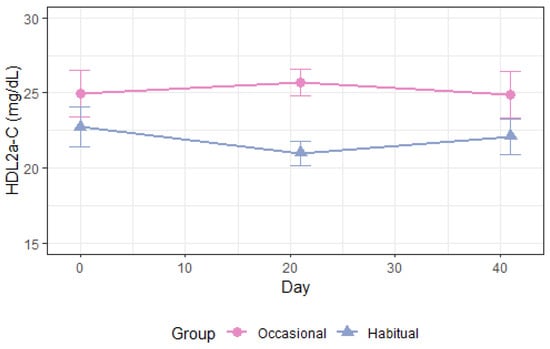 | HDL2a-TG, mg/dL Occ. vs. Hab. All | −0.001 (−0.7–0.7) | 0.99 | −0.8 (−1.5–[−0.05]) | 0.04 | −0.4 (−0.9–0.1) | 0.14 |