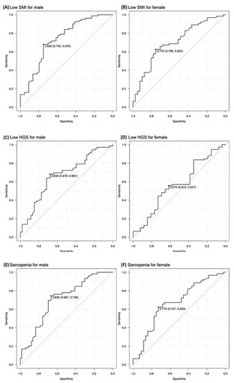 The temporal muscle thickness (TMT) cutoff values for identifying low skeletal muscle index (SMI), low hand grip strength (HGS), and sarcopenia. The TMT cutoff values for identifying low SMI were 3.83 mm for men and 2.78 mm for women (A,B, respectively). The TMT cutoff values for identifying low HGS were 3.83 mm for men and 3.08 mm for women (C,D, respectively). The TMT cutoff values for identifying sarcopenia were 3.83 mm for men and 2.78 mm for women (E,F, respectively).