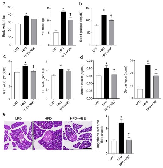 To examine the anti-obesity effect of ABE on HFD-fed mice, the mice were fed for 12 weeks with HFD supplementing ABE. As shown in Figure 2a, HFD-fed mice exhibited a significant increase of body weight and fat mass compared to LFD-fed mice, whereas only fat mass in HFD-fed mice was significantly reduced by ABE supplementation. In addition to fasting blood glucose levels, HFD-induced glucose tolerance was improved by ABE (Figure 2b,c). However, compared to HFD-fed mice, there was no significant reduction of glucose levels in HFD+ABE-fed mice during ITT (Figure 2c). Hyperinsulinemia and hyperleptinemia in HFD-fed mice were significantly reduced by ABE (Figure 2d). Additionally, histological analysis showed that the Langerhans islet area of β cells is significantly increased in HFD-fed mice, but this area is reversed by ABE (Figure 2e). These results indicate that ABE feeding could improve insulin resistance in HFD-fed mice by reducing fat mass.