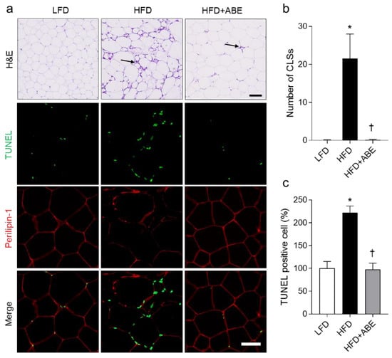 HFD-induced obesity promotes adipocyte death and immune cell infiltration in the adipose tissue, for which they exacerbate inflammation and insulin resistance. Crown-like structures (CLSs) in the adipose tissue are a histological marker of inflammation [2,3]. We assessed the histological analysis in the epididymal fat pads using H&E and TUNEL staining. H&E staining revealed that HFD-induced CLSs were significantly reversed by ABE administration (Figure 4a,b). HFD-fed mice exhibited many more TUNEL-positive cells around perilipin 1-free adipocytes than LFD-fed mice (Figure 4a). However, ABE administration reduced TUNEL-positive adipocytes (Figure 4c). These data suggest that ABE could protect against HFD-induced adipocyte death and improve insulin resistance.
