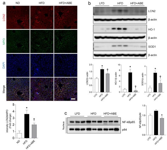 To investigate the protective effects of ABE on inflammation and oxidative stress in hepatic steatosis, we examined hepatic LCN2, HO-1, and SOD1 expressions (Figure 6). In line with LCN2-positive neutrophils in the adipose tissues (Figure 5), we also found that many LCN2-positive cells are observed in MPO-positive neutrophils in the liver sections of HFD-fed mice compared to LFD-fed mice (Figure 6a). However, ABE supplementation significantly attenuated LCN2-positive neutrophils in the liver of HFD-fed mice. Western blot analysis showed that HFD-induced LCN2, HO-1, and SOD1 expressions were significantly decreased in the liver of HFD+ABE-fed mice (Figure 6b). Furthermore, we investigated the effect of ABE on the nuclear expression of NF-kBp65 as a transcription factor of LCN2 [8,12]. The nuclear NF-kBp65 level was reduced in HFD+ABE-fed mice compared to HFD-fed mice (Figure 6c). These results suggest that ABE may play an important role in anti-inflammation and anti-oxidative stress in hepatic steatosis.