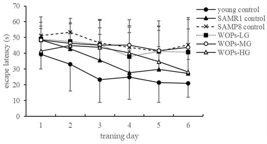 During the place navigation test, there is no significant difference in swimming speed between the groups. It can be considered that swimming speed will not interfere with the time for mice to find the platform, that is, the result of the escape latency. Thus, the escape latency of the mice can be used to reflect the spatial learning and memory level of the mice. With the increase in training days, the duration of escape latency in each group showed a decreasing trend (Figure 1). During the spatial probe test, the escape latency of SAMP8 old mice was significantly higher than that of the young and SAMR1 control groups. Among them, the escape latency of mice in WOP-treated groups was shortened in the comparison with SAMP8 control. The escape latency of the WOPs-HG group was significantly different from that of the SAMP8 control group (p < 0.05).
