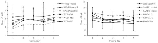 The number of active avoidances of mice in each group gradually increases with the number of days, and the number of electric shocks gradually increases with the number of days (Figure 2). A decrease indicates that the learning effect of the mice on the acousto-optic conditioned reflex is continuously enhanced; compared with the young group, the number of active avoidances of the old control SAMP8 mice is reduced, and the number of electric shocks is increased. WOPs-MG and the intervention of WOPs-HG increased the number of active avoidances of SAMP8 mice and reduced the number of electric shocks, which can reach the level of SAMR1 and the young control group, suggesting that WOPs can enhance the weakened escape of electrical stimulation in old SAMP8 mice, showing its ability to improve conditioned reflexes.