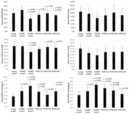 Otherwise, compared to the mice in the young and SAMR1 control groups, the MDA content of serum and hippocampus tissue was markedly higher in the SAMP8 control group (p < 0.01). Compared with the SAMP8 control group, the MDA content of the serum was lower in WOPs-MG and WOPs-HG (p < 0.01 for WOPs-MG; p < 0.05 for WOPs-LG and WOPs-HG), while the MDA content of hippocampus tissue was greatly decreased in all WOP groups (p < 0.05) (shown in Figure 3).