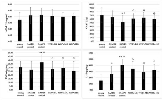 A marked difference was found in ChAT activity among the three controls (p < 0.05); but no difference in AChE (shown in Figure 4). The treatment of WOPs significantly increased the ChAT activity of aging mice (p < 0.05). However, the AChE activity showed no difference among the WOP groups (p > 0.05). Compared with the young and SAMR1 controls, the concentrations of IL-1β and TNF-α were significantly increased in the SAMP8 control group (p < 0.01). Additionally, both IL-1β and TNF-α present a lower level in all the WOPs in comparison with SAMP8 control (p < 0.05).