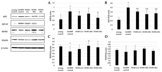 Effects of WOPs on the expression of APP, Aβ1-42, BDNF, and PSD95 in the hippocampus by Western blot; data were analyzed using a non-parametric test. Data are presented as the mean ± SD (n = 3 per group). * p < 0.05 vs. the young control; Δ p < 0.05 vs. the SAMP8 control.