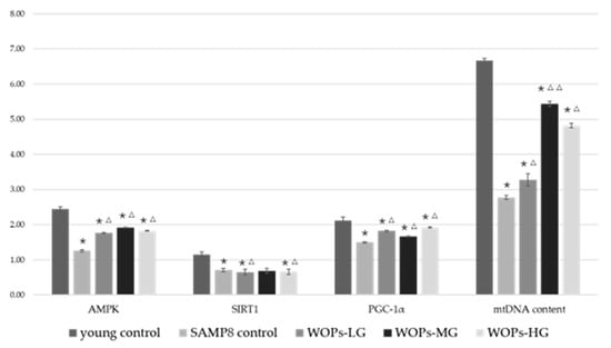 Effects of WOPs on mitochondrial function factors and relative mtDNA content in the hippocampus by real-time PCR analysis; data were analyzed using a non-parametric test. Data are presented as the mean ± SD (n = 5–6 per group). * p < 0.05 vs. the young control; Δ p < 0.05, ΔΔ p < 0.001 vs. the SAMP8 control.
