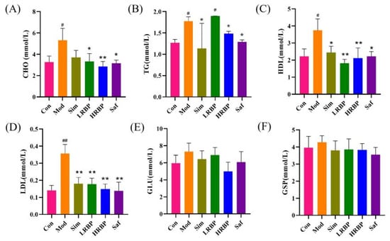 At the end of the experiment, the serum CHO, TG, HDL, and LDL levels in the Mod group were higher than those in the Con group (p < 0.05) (Figure 1A–D). RBPs treatment notably ameliorated the elevated serum CHO, HDL, and LDL levels (p < 0.05). In the Sim group, hyperlipidemia was also improved. We also determined the serum levels of GLU and GSP in mice from each group, as shown in Figure 1E,F. No differences in the serum levels of GSP and GLU were observed among the six groups.