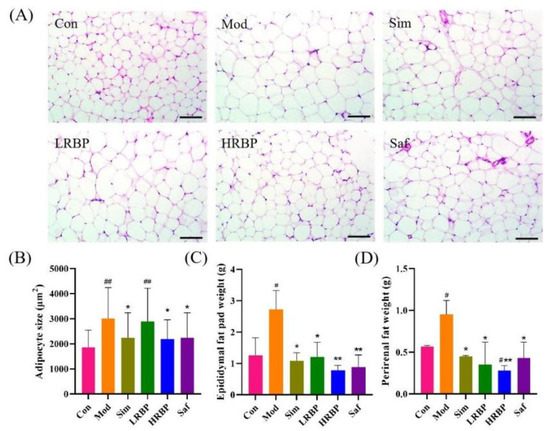 Effect of RBPs on adipose tissue in HFD-fed mice. (A) The results of HE staining of epididymal fat (scale bar = 100 µm). (B) Epididymal adipocyte size of mice. The result was measured with Image-J (Available online: https://imagej.net/Fiji/Downloads (accessed on 12 October 2022), USA National Institutes of Health, Bethesda, ML, USA). (C,D) Weights of epididymal and perirenal adipose tissue. # p < 0.05, ## p < 0.01 compared to Con group, * p < 0.05, ** p < 0.01 compared to Mod group. Con, control group fed with normal diet; Mod, model group fed with HFD; Sim, positive control group fed with HFD and treated with simvastatin; LRBP, low dose RBPs group fed with HFD and treated with 200 mg/kg RBPs; HRBP, high dose RBPs group fed with HFD and treated with 600 mg/kg RBPs; Saf, safety evaluation group fed with normal diet and treated with 600 mg/kg RBPs.