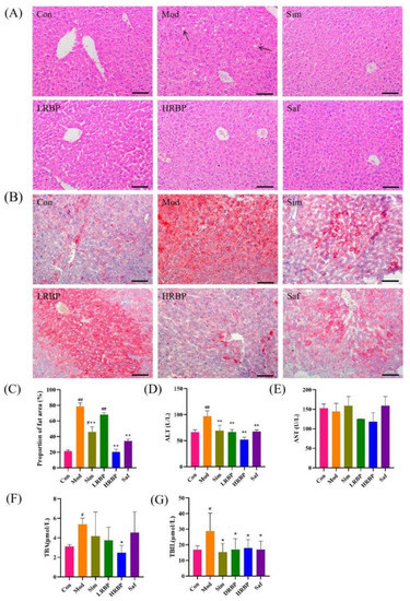 Protective effect of RBPs on the liver in mice. (A) The results of HE staining (scale bar = 100 µm). (B) The results of oil red O staining (scale bar = 100 µm). (C) The ratio of red area to the total area in oil red O staining results. The results were measured by Image-Pro Plus 6.0 software. (D–G) The content of ALT, AST, TBA, and TBIL in the serum of mice. # p < 0.05, ## p < 0.01 compared to Con group, * p < 0.05, ** p < 0.01 compared to Mod group. Con, control group fed with normal diet; Mod, model group fed with HFD; Sim, positive control group fed with HFD and treated with simvastatin; LRBP, low dose RBPs group fed with HFD and treated with 200 mg/kg RBPs; HRBP, high dose RBPs group fed with HFD and treated with 600 mg/kg RBPs; Saf, safety evaluation group fed with normal diet and treated with 600 mg/kg RBPs.