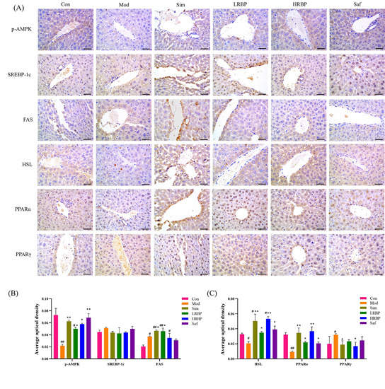 Effect of RBPs on the expression of lipid metabolism-related genes in the liver. (A) Immunohistochemical results of mice liver (scale bar = 50 µm). (B,C) Determination results of average optical density. The results were measured by Image-Pro Plus 6.0 software. # p < 0.05, ## p < 0.01 compared to Con group, * p < 0.05, ** p < 0.01 compared to Mod group. Con, control group fed with normal diet; Mod, model group fed with HFD; Sim, positive control group fed with HFD and treated with simvastatin; LRBP, low dose RBPs group fed with HFD and treated with 200 mg/kg RBPs; HRBP, high dose RBPs group fed with HFD and treated with 600 mg/kg RBPs; Saf, safety evaluation group fed with normal diet and treated with 600 mg/kg RBPs.