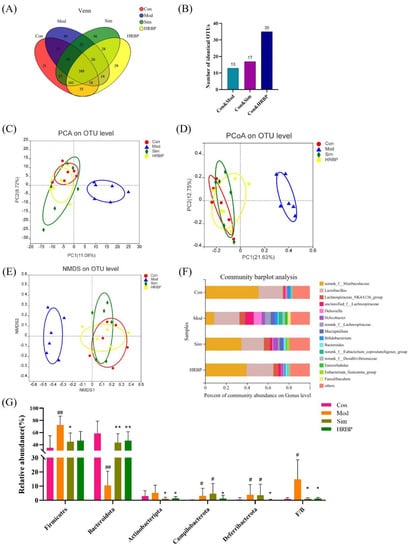 The Venn diagram also presented similar results (Figure 5A). The four groups have 388 shared OTUs. The Mod, Sim, and HRBP groups, respectively, shared 13, 17, and 35 identical OTUs with the Con group (Figure 5B). The RBPs intervention increased the number of OTUs shared by the Mod group and Con group, which confirmed that RBPs increased the similarity of the gut microbiota composition between HFD mice and normal mice.