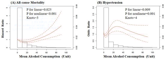 Curvilinear association of mean alcohol consumption with all-cause mortality (A) and newly onset hypertension (B). Panel (A) was conducted with restricted cubic spline using Cox regression model. Panel (B) was conducted with restricted cubic spline using logistics regression model. Both panels (A,B) were adjusted for age, sex, marital status, education, residence area, smoking status, mean BMI, mean waist circumference.
