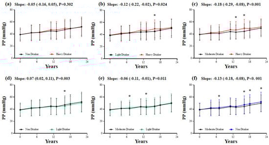 For PP, moderate drinkers had the lowest speed of increase among the four classes (slope: −0.18 (−0.29, −0.08), relative to heavy drinkers; slope: −0.06 (−0.11, −0.01), relative to light drinkers; slope: −0.13 (−0.18, −0.08), relative to non-drinkers). In addition, the PP of non-drinkers elevated faster than that of the light drinkers (slope: 0.07 (0.02, 0.11)) (Figure 4).